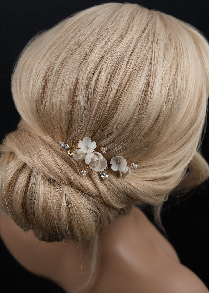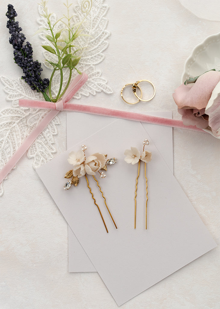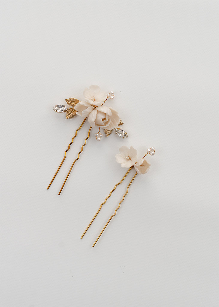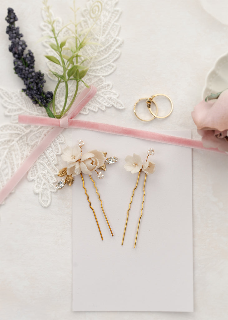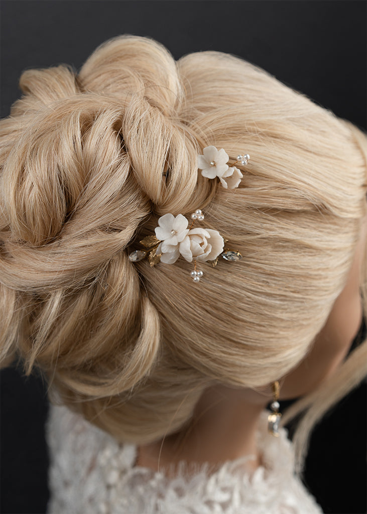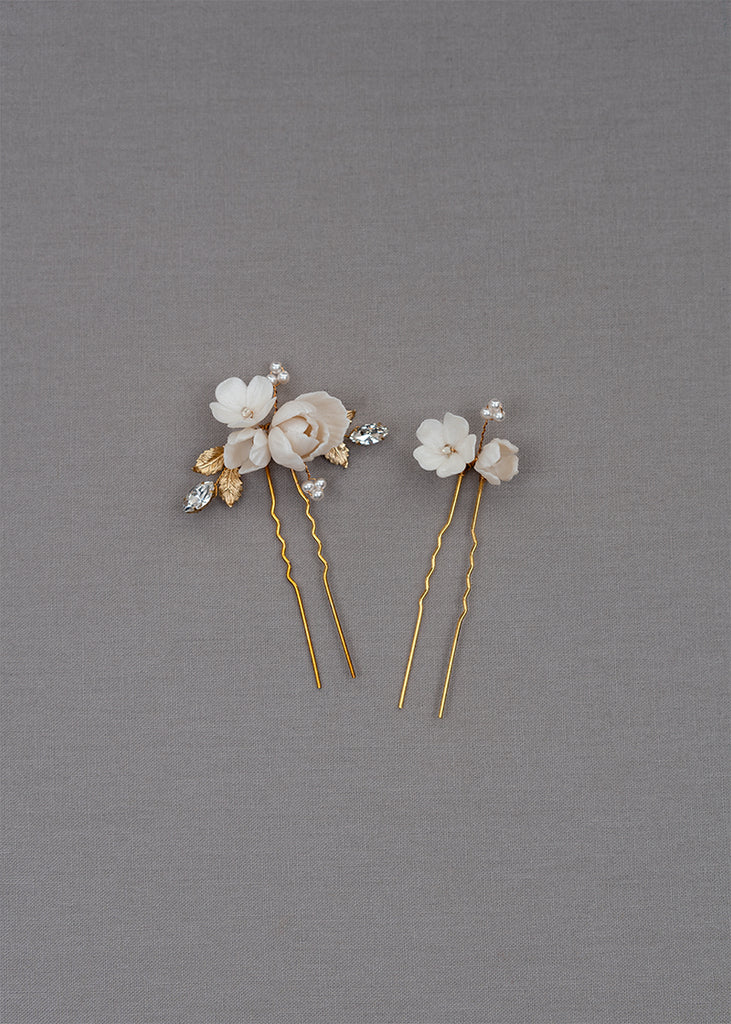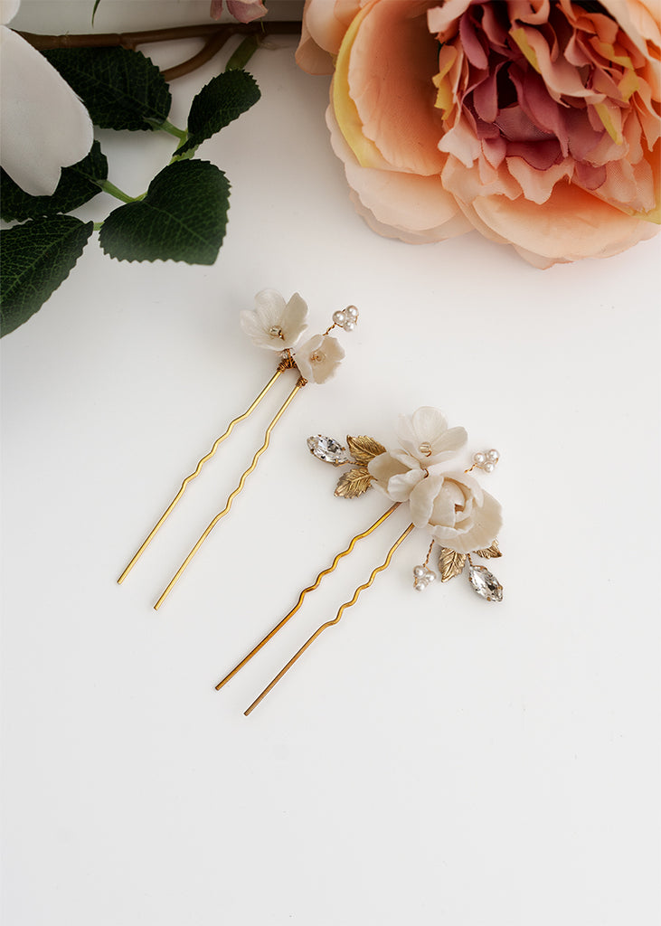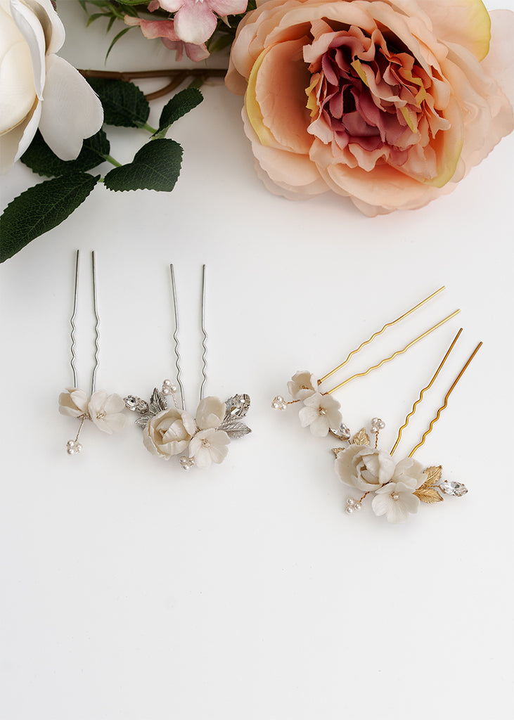 Brielle Floral Wedding Hair Pins are a beautifully handcrafted accessory that will add a special touch to your big day. These clay flowers are carefully handcrafted in our studio by Michelle, and her dedicated attention to detail truly shines through. If you're wanting to add a touch of botanical beauty to your bridal look with these nature-inspired hair pins. They will be the perfect addition to your wedding day ensemble.