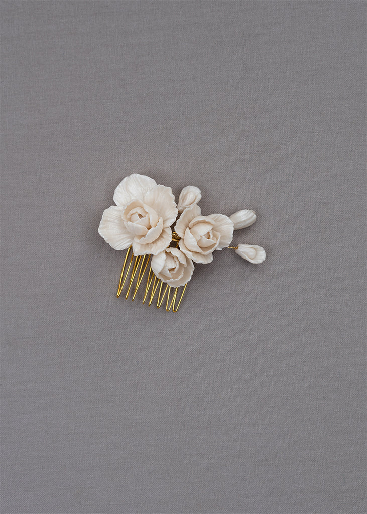 Whitney Petite Bridal Comb. Indulge in the perfect blend of beauty and versatility with the Whitney collection. Whether worn together for a customized effect or separately for a touch of refinement, this design caters to those with a love for minimalistic and delicate touches. Drawing inspiration from a garden in full bloom, these elegant hair pieces effortlessly exude a romantic charm and sophisticated appeal ideal for your wedding day. Place them in the hair style of your choice for that romantic touch.