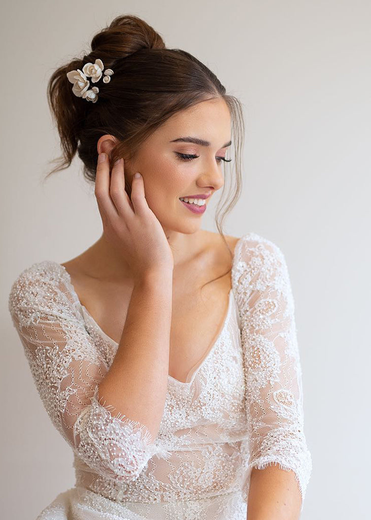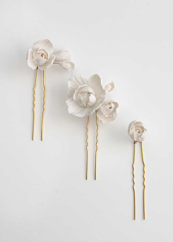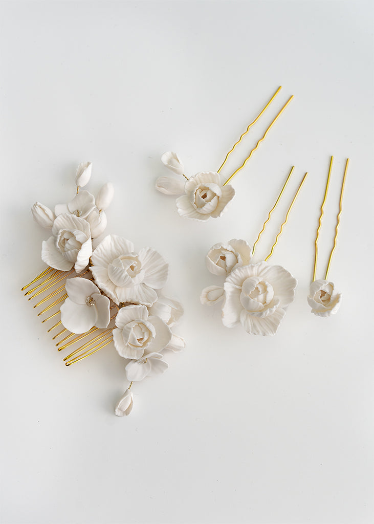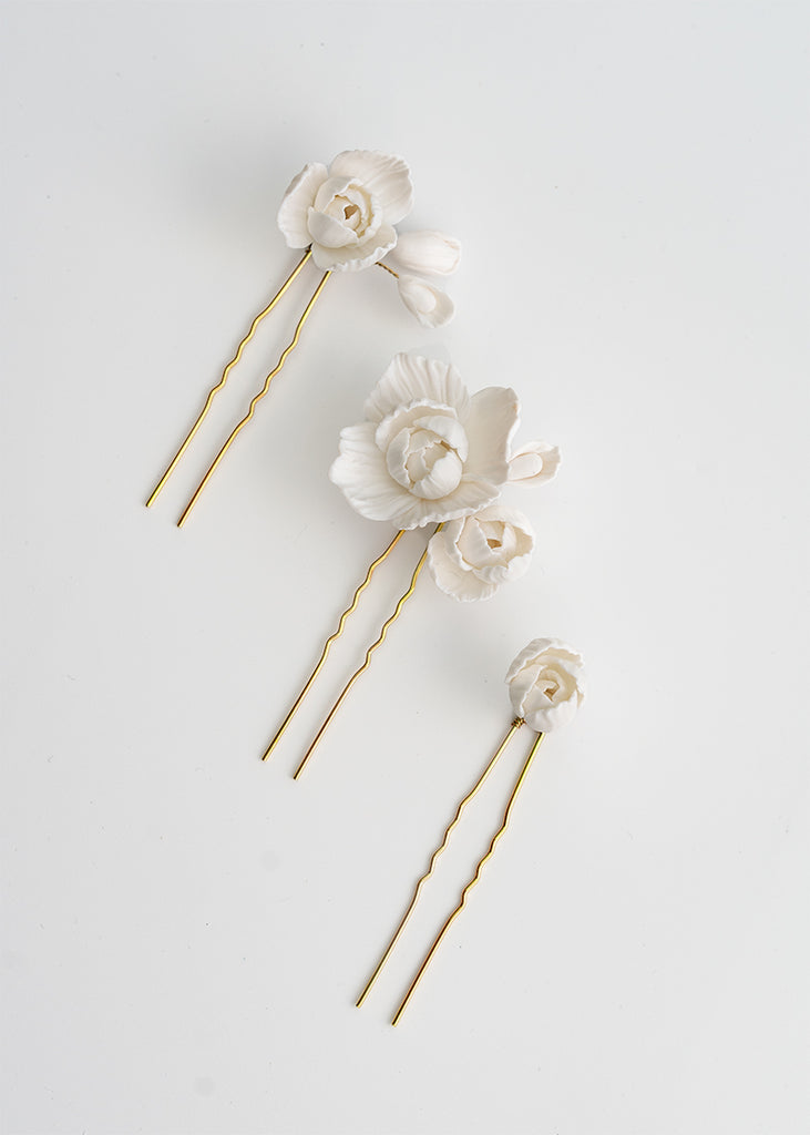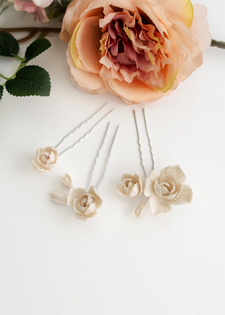Whitney Wedding Hair Pins are a floral design expertly arranged and are a must-have for any bridal ensemble. These versatile handmade clay flower pins can be used to create a stunning look for your wedding day, whether your hair is styled up or down. They can be worn simply and elegantly or paired with the Whitney comb for an extra touch of extravagance.