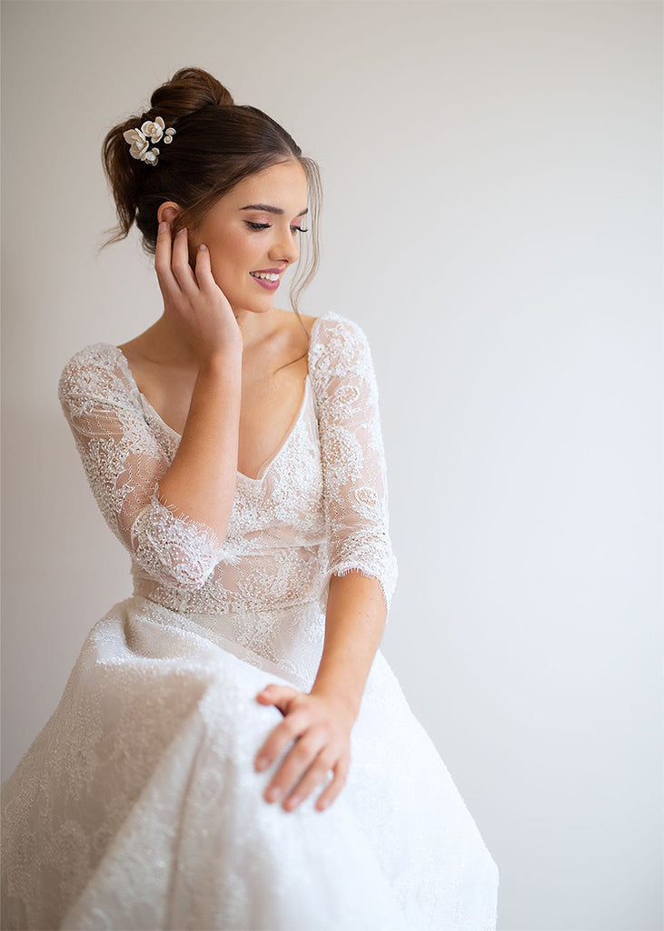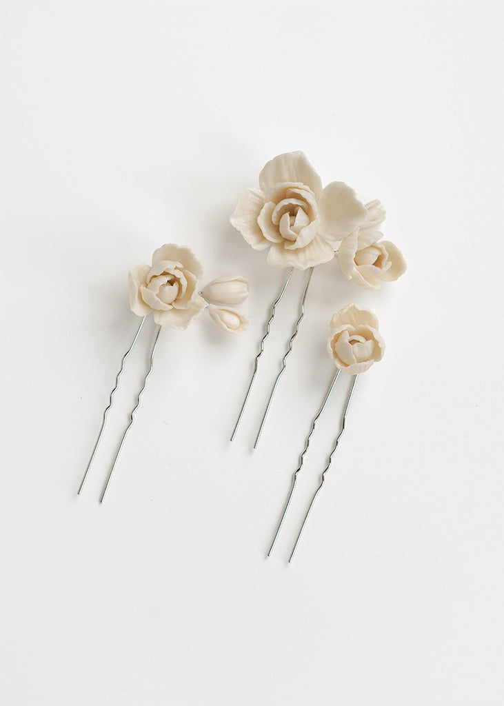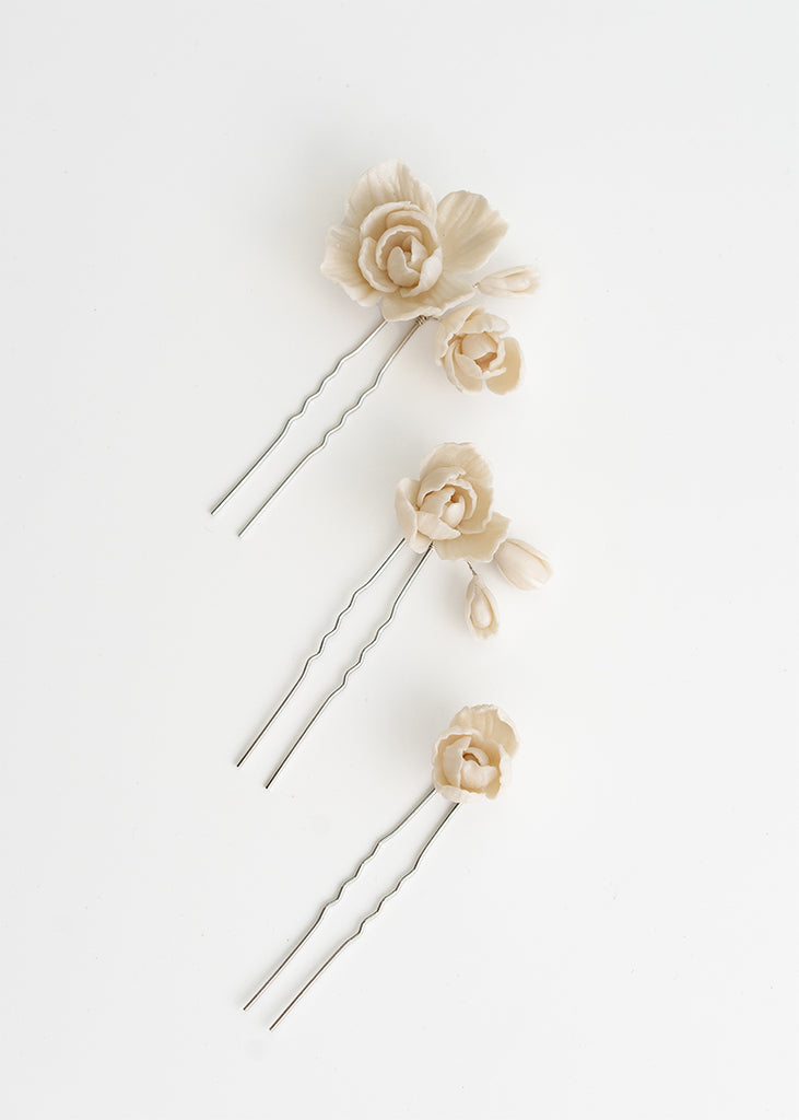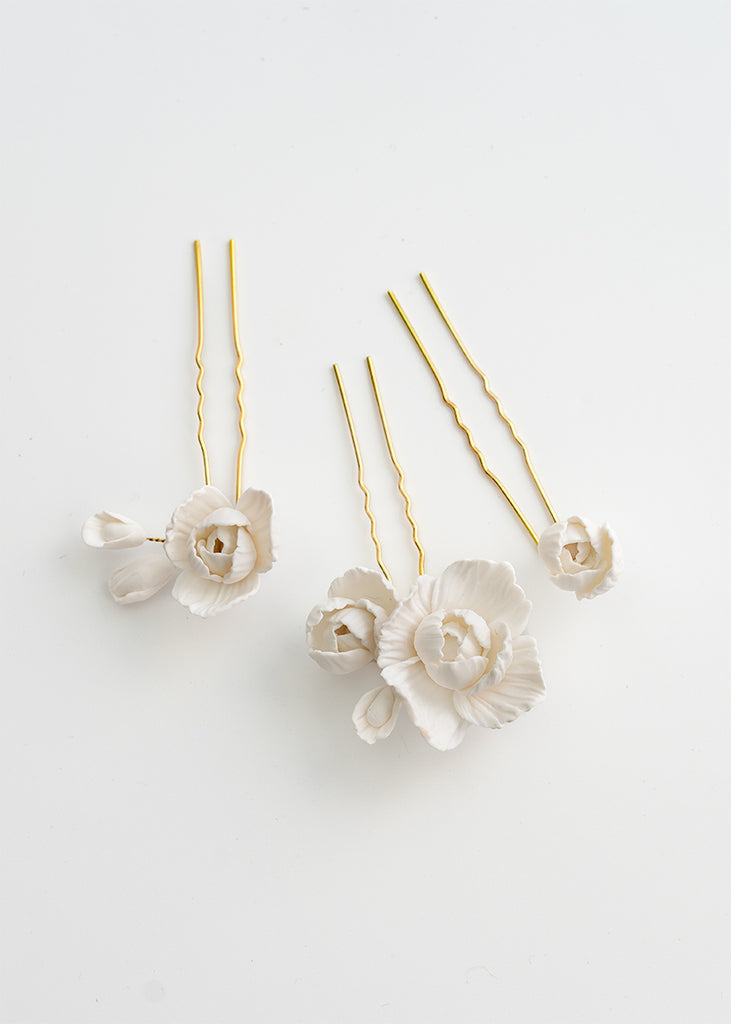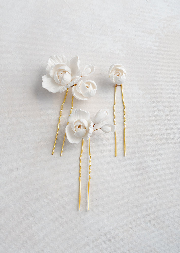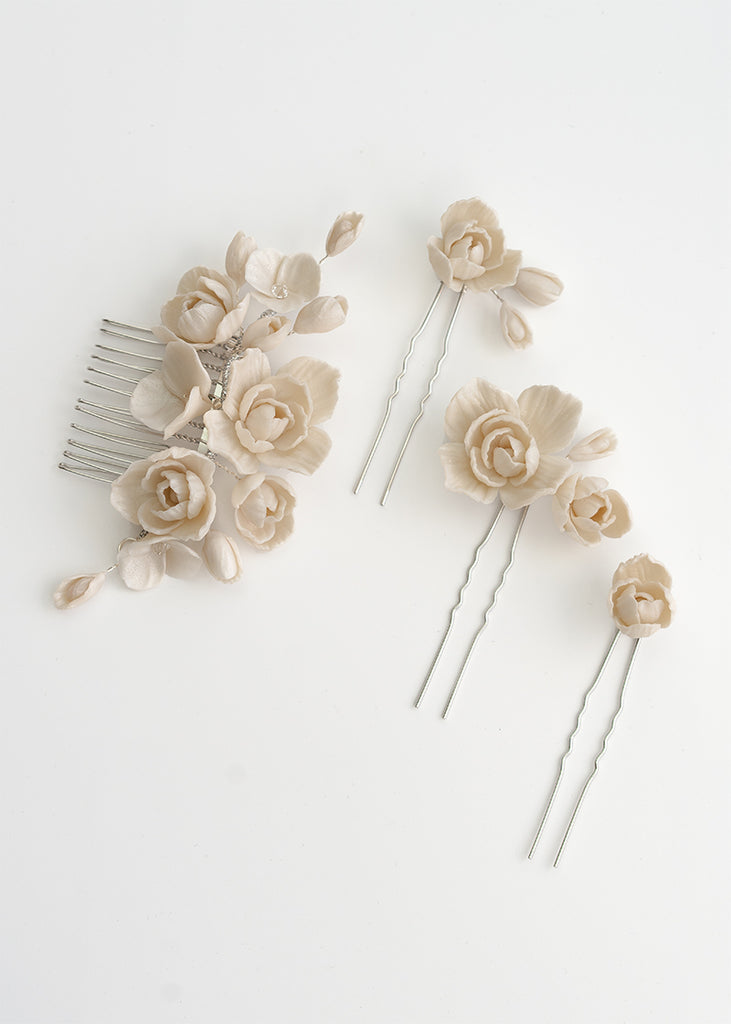 Whitney Wedding Hair Pins are a floral design expertly arranged and are a must-have for any bridal ensemble. These versatile handmade clay flower pins can be used to create a stunning look for your wedding day, whether your hair is styled up or down. They can be worn simply and elegantly or paired with the Whitney comb for an extra touch of extravagance.